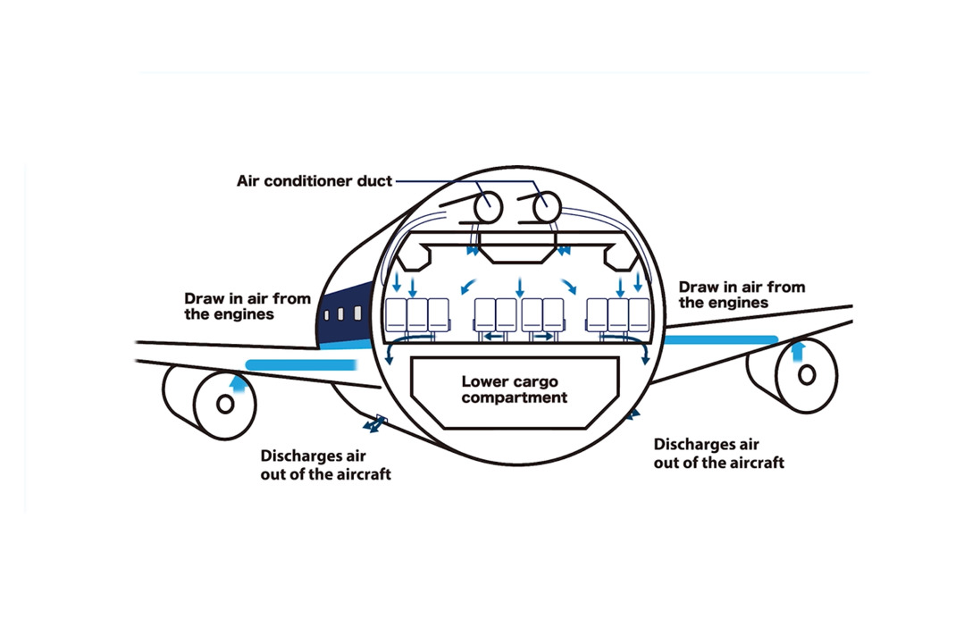 ഏകദേശം 19 ഡിഗ്രി ചൂടിൽ കാബിനിലേക്ക് ആനയിക്കപ്പെടുന്ന ഈ വായുവിൽ നല്ല ചൂടുള്ള ട്രിം എയർ (ഇതും ബ്ലീഡ് എയറിന്റെ ഒരു ഭാഗം തന്നെ) കൂട്ടിക്കലർത്തി ആവശ്യമുള്ള തണുപ്പിൽ എല്ലായിടത്തും എത്തിക്കുന്നത് കാബിനിന്റെ മുകളിൽ പിന്നിൽ നിന്ന് മുന്നറ്റം വരെ നീളുന്ന ഓവർഹെഡ് ഡിസ്റ്റ്രിബ്യൂഷൻ ഡക്ടുകളാണ്. ഈ പാത്തികളിൽ നി്ന്ന് ഓരോ നിര സീറ്റുകളിലേക്കും ഈ വായു പ്രത്യേകമായി തുറന്നുവിടുകയാണ് ചെയ്യുക. വിമാനത്തിന്റെ ഇരുവശത്തെ ഭിത്തികളിലുമുള്ള സൈഡ് വാൾ റെയിസേഴ്സ് എന്ന പൈപ്പുകളാണ് വായുവിനെ ഇവിടെ എത്തിക്കുന്നത്. ഓരോ നിര സീറ്റുകളിലുമുള്ളവർക്കും തണുക്കാനും ശ്വസിക്കാനും കൊടുത്തശേഷം ഏകദേശം 2-3 മിനിറ്റിനുള്ളിൽ വിമാനത്തിന്റെ തറനിരപ്പിൽ ഇരുവശത്തെ ഭിത്തികളിലുമുള്ള വിടവുകളിലൂുടെ ഈ വായുവിനെ താഴെ കാർഗോ ഹോൾഡിലേക്ക് വലിച്ചെടുക്കുന്നു. ഇങ്ങിനെ വലിച്ചെടുത്തതിൽ പാതിയോളം വിമാനം പുറത്ത് അന്തരീക്ഷത്തിലേക്ക് തള്ളും. ബാക്കി നേരെ വീണ്ടും അരിപ്പയിലേക്കും മിക്സ് മാനിഫോൾഡിലേക്കും എത്തും. എൻജിനുകളിൽ നിന്നെത്തുന്ന പുത്തൻ ബ്ലീഡ് എയറുമായി ഇടകലരാനും പാസഞ്ചർ കാബിനിലേക്ക് തിരിച്ചെത്താനും.വിമാനത്തിലെ ഒരു നിരയിൽ ഒരു യാത്രക്കാരനുണ്ട് എന്ന് കരുതുക. അയാൾ നിശ്വസിക്കുന്ന വൈറസ് കലർന്ന വായു ബാക്കിയുള്ളവർക്ക് കിട്ടുമോ എന്ന് ചിലർക്ക് എങ്കിലും സംശയം വരാം. ഓരോ നിര സീറ്റുകൾക്കും വെവ്വേറെ വായുനൽകുന്ന രീതിയുള്ളതുകൊണ്ട് മറ്റ് നിര യാത്രക്കാർക്കാർക്കും ഇത്തരത്തിലുള്ള വൈറസ് സംക്രമണ സാധ്യത ഇല്ല. അവിടെയാണ് നേരുത്തെ പറഞ്ഞ നമ്മുടെ എച്ച്ഇപിഎ ഫിൽറ്ററുകളുടെ കാര്യക്ഷമതയായ 0.3 മൈക്രോൺ അരിപ്പ . ഇതിന്റെ കണ്ണികളേക്കാൾ ചെറിയ സൂക്ഷ്മാണുക്കളേയും ഇത് തടഞ്ഞു നിർത്താറുണ്ട് എന്നതാണ് പ്രായോഗിക തലത്തിൽ കണ്ടു വരുന്നത്. കാരണം ഉപയോഗം കൂടുന്തോറും അഴുക്കടിഞ്ഞ് കണ്ണികൾ ചെറുതാകുന്നതും 99.97 സൂക്ഷ്മാണുവിമുക്തമാണ് ഈ ഫിൽറ്ററിൽ നിന്ന് പുറത്തെത്തുന്ന വായു.